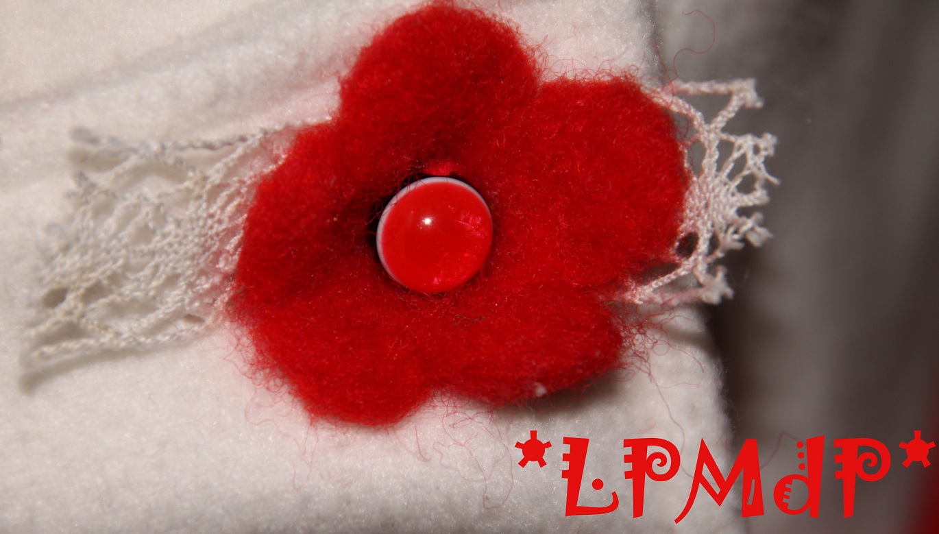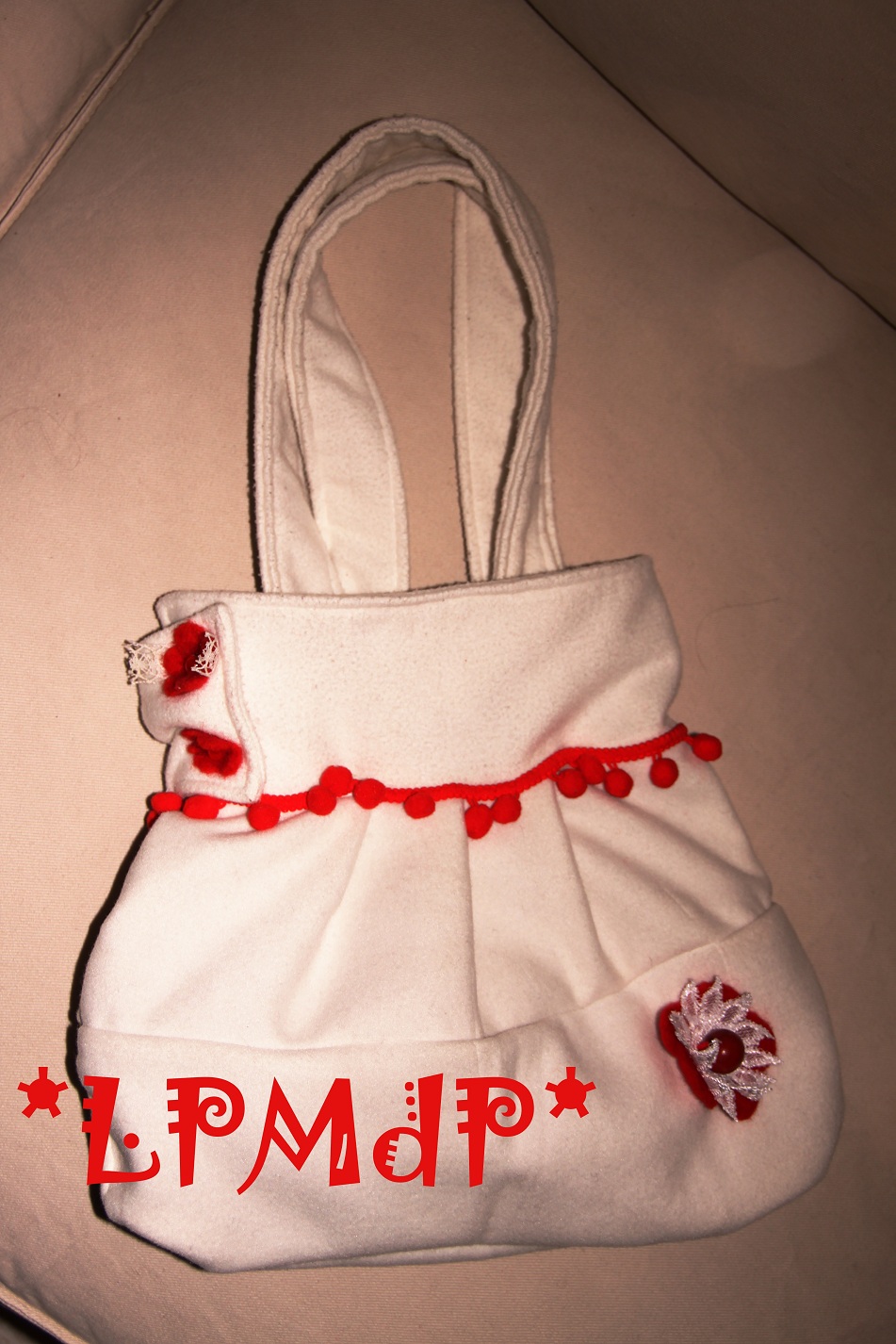 Une rangée de pompons pendants, une flerette et tout de suite le sac devient plus joli. Un modèle "haute couture" ?!? Ce Rouge et blanc en tout cas est parfait